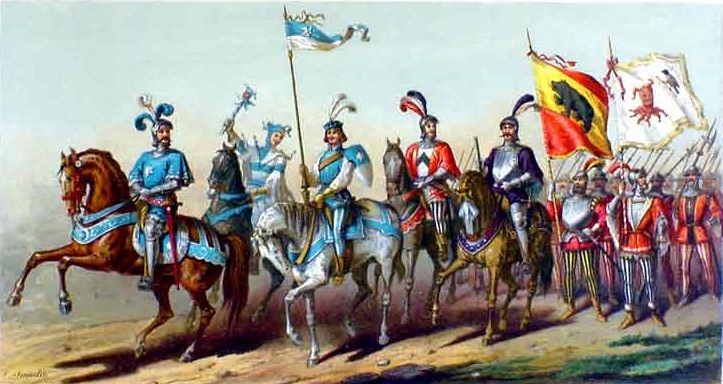 Adrian von Bubenberg 1434-1479|Adrian von Bubenberg, Konrad und Niklaus von Scharnachtal und Wilhelm von Diesbach kehren von der Verbannung in die Stadt Bern zurück - Schilling-Chronik